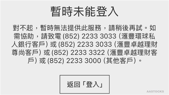 The HSBC mobile app 'HSBC HK' experienced a crash this afternoon, rendering it temporarily inaccessible for some users. The mobile app page displayed the message 'Sorry, this service is currently unavailable. Please try again later.' AASTOCKS Financial News Website: www.aastocks.com |