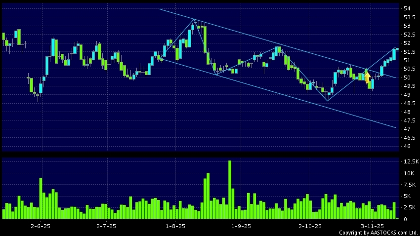 POWER ASSETS(00006.HK) appears an upside range breakout. Last printed at 51.650; Flattish; on volume of 285.91K shares and turnover of $14.78MRecent PerformanceIn 3 days: +1.175%In...