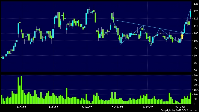 WUXI APPTEC(02359.HK) appears an upside breakout, rose above the neckline. Last printed at 120.000; rose 8.303%; on volume of 11.98M shares and turnover of $1.42BRecent Performance...