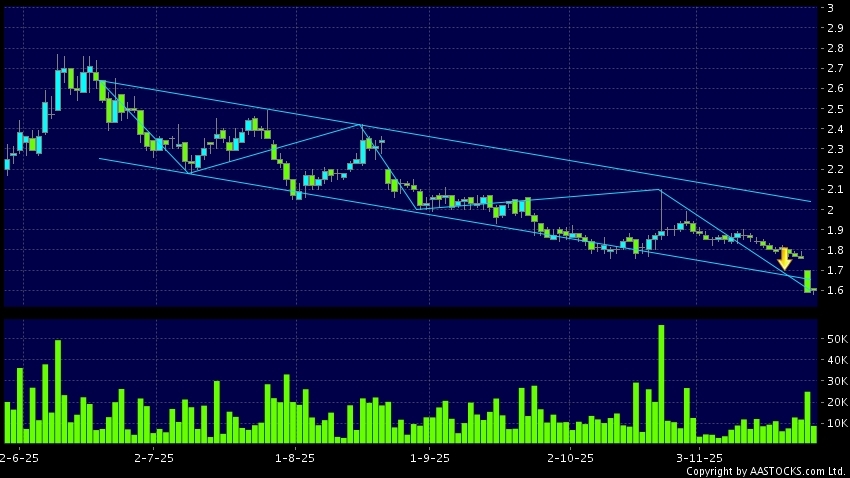 SUNART RETAIL(06808.HK) appears a downside range breakout. Last printed at 1.620; rose 1.887%; on volume of 10.14M shares and turnover of $16.23MRecent PerformanceIn 3 days: -8.475...