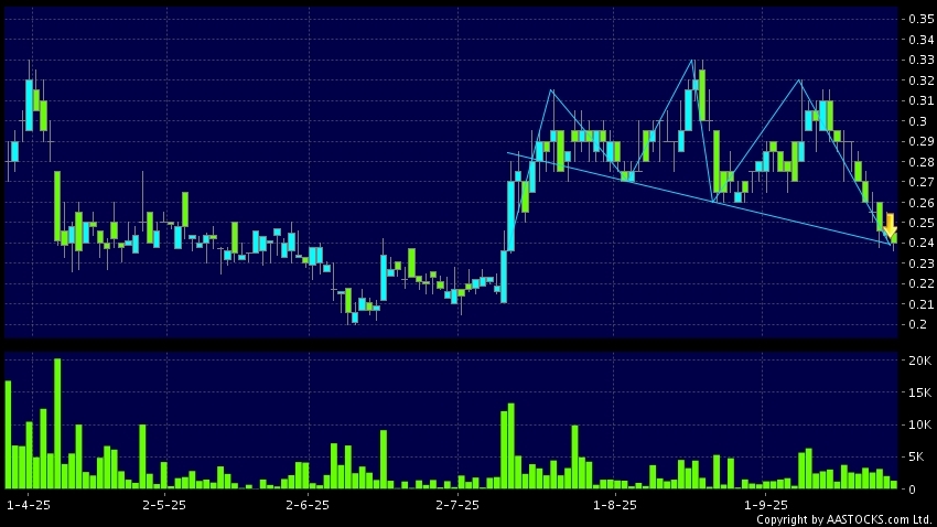 绿景中国地产(00095.HK) +0.010 (+4.000%) 呈现头肩顶向下突破。现价报0.240,下跌3.226%,成交量1.28百万股,成交额30.65万。