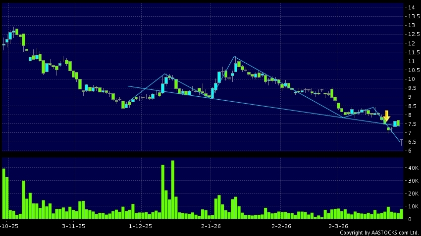 中国光大控股(00165.HK) -1.080 (-14.595%) 沽空 $1.76千万; 比率 13.447% 呈现头肩顶向下突破。现价报6.660,下跌10.000%,成交量8.15百万股,成交额5.30千万。