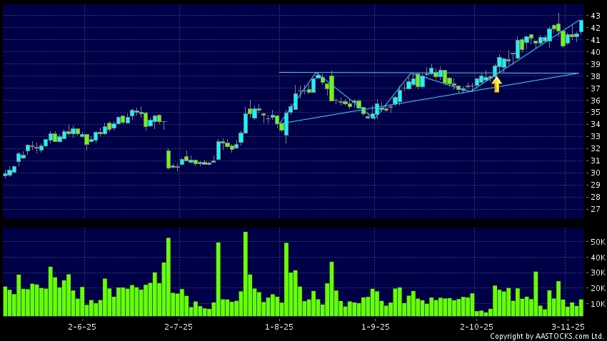 三角形向上突破是指股价的波幅渐渐收窄,在图表上形成三角形般的状态。股价在三角形的末端向上突破,形成上升趋势,技术走势向好。(港股报价延迟最少十五分钟。沽空资料截至 2025-11-06 16:25。)
