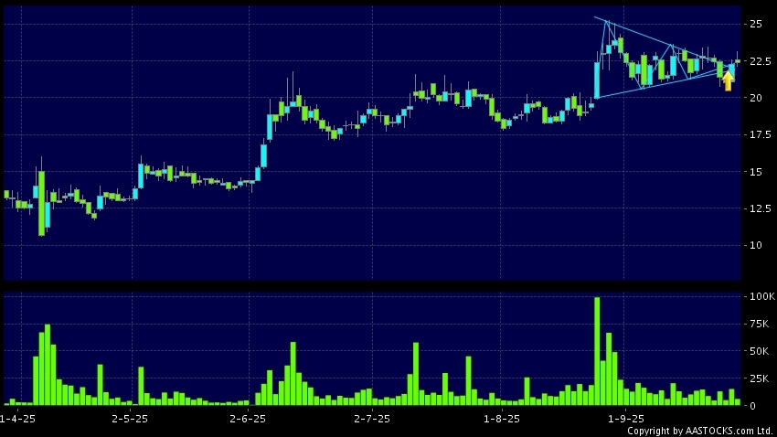 三角形向上突破是指股价的波幅渐渐收窄,在图表上形成三角形般的状态。股价在三角形的末端向上突破,形成上升趋势,技术走势向好。(港股报价延迟最少十五分钟。沽空资料截至 2025-10-10 16:25。)