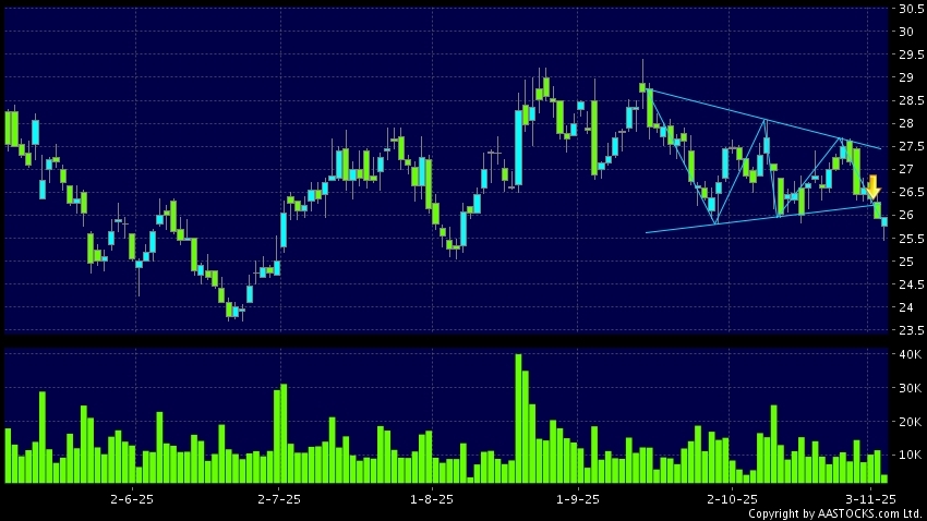 三角形向下突破是指股价的波幅渐渐收窄,在图表上形成三角形般的状态。股价在三角形的末端向下突破,下跌趋势形成,技术走势偏软。(港股报价延迟最少十五分钟。沽空资料截至 2025-11-10 16:25。)