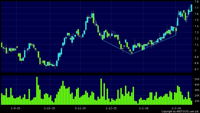 杯柄形突破是一個向好的技術形態,將利好股價走勢。(港股報價延遲最少十五分鐘。沽空資料截至 2026-02-24 16:25。)