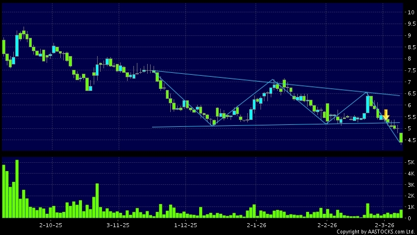 三角形向下突破是指股價的波幅漸漸收窄,在圖表上形成三角形般的狀態。股價在三角形的末端向下突破,下跌趨勢形成,技術走勢偏軟。(港股報價延遲最少十五分鐘。)