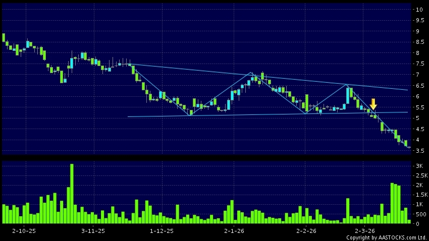 三角形向下突破是指股價的波幅漸漸收窄,在圖表上形成三角形般的狀態。股價在三角形的末端向下突破,下跌趨勢形成,技術走勢偏軟。(港股報價延遲最少十五分鐘。)