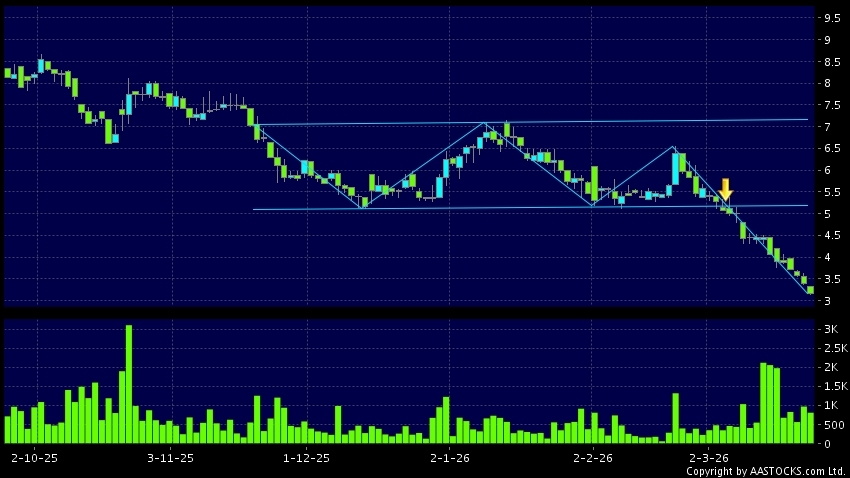 區域突破指股價在過去的一段時間只在一個範圍在內活動,然後股價下跌作出突破,跌穿區域的底部,技術走勢偏軟。(港股報價延遲最少十五分鐘。)