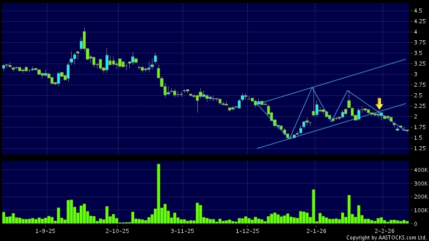 區域突破指股價在過去的一段時間只在一個範圍在內活動,然後股價下跌作出突破,跌穿區域的底部,技術走勢偏軟。(港股報價延遲最少十五分鐘。沽空資料截至 2026-02-11 12:25。)