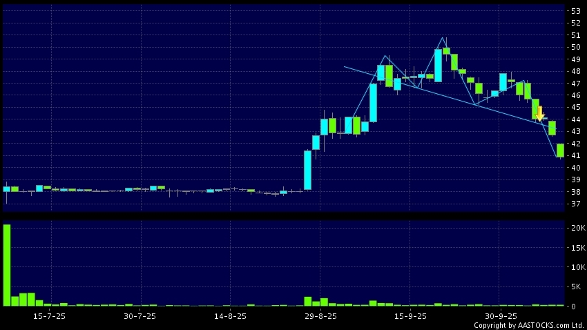 富衛集團(01828.HK) +0.400 (+0.983%) 呈現頭肩頂向下突破。現價報40.900,下跌4.260%,成交量37.26萬股,成交額1.53千萬。