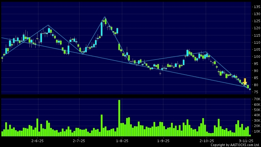 理想汽車-W(02015.HK) +1.400 (+1.810%) 沽空 $9.61千萬; 比率 21.409% 呈現頭肩頂向下突破。現價報77.450,下跌0.386%,成交量4.26百萬股,成交額3.27億。