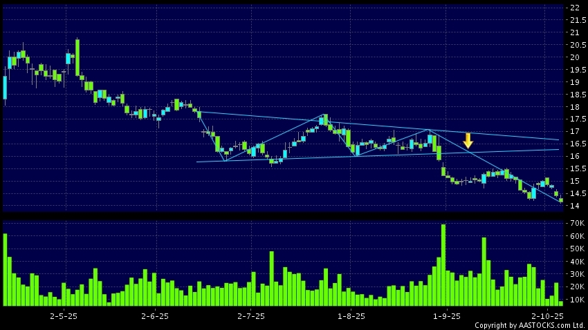 三角形向下突破是指股價的波幅漸漸收窄,在圖表上形成三角形般的狀態。股價在三角形的末端向下突破,下跌趨勢形成,技術走勢偏軟。(港股報價延遲最少十五分鐘。沽空資料截至 2025-10-08 16:25。)