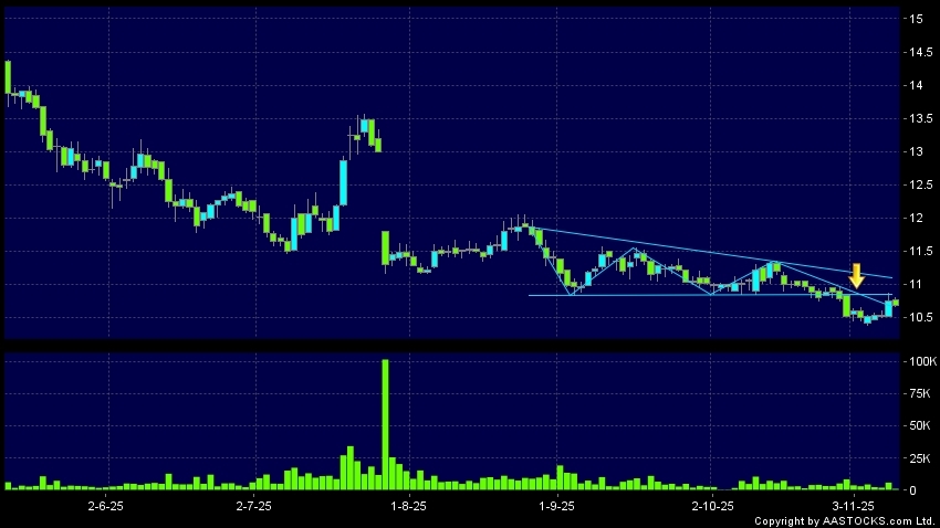 三角形向下突破是指股價的波幅漸漸收窄,在圖表上形成三角形般的狀態。股價在三角形的末端向下突破,下跌趨勢形成,技術走勢偏軟。(港股報價延遲最少十五分鐘。沽空資料截至 2025-12-01 16:25。)