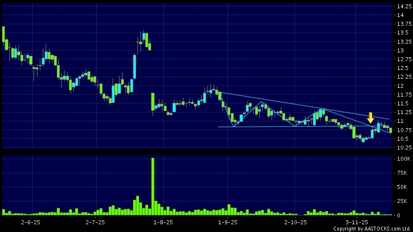 三角形向下突破是指股價的波幅漸漸收窄,在圖表上形成三角形般的狀態。股價在三角形的末端向下突破,下跌趨勢形成,技術走勢偏軟。(港股報價延遲最少十五分鐘。沽空資料截至 2025-12-01 16:25。)