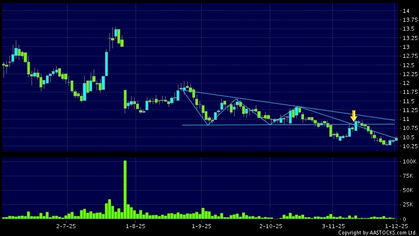 三角形向下突破是指股價的波幅漸漸收窄,在圖表上形成三角形般的狀態。股價在三角形的末端向下突破,下跌趨勢形成,技術走勢偏軟。(港股報價延遲最少十五分鐘。沽空資料截至 2025-12-01 16:25。)
