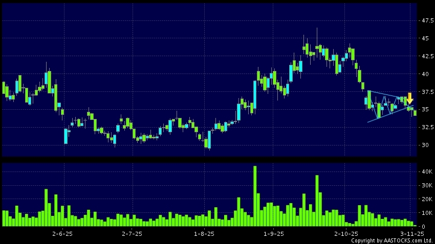 三角形向下突破是指股價的波幅漸漸收窄,在圖表上形成三角形般的狀態。股價在三角形的末端向下突破,下跌趨勢形成,技術走勢偏軟。(港股報價延遲最少十五分鐘。沽空資料截至 2025-11-24 16:25。)