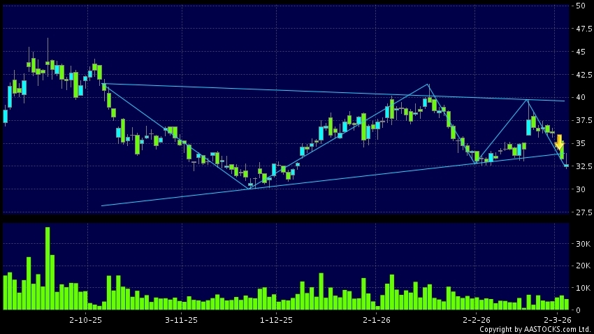 三角形向下突破是指股價的波幅漸漸收窄,在圖表上形成三角形般的狀態。股價在三角形的末端向下突破,下跌趨勢形成,技術走勢偏軟。(港股報價延遲最少十五分鐘。沽空資料截至 2026-03-25 16:25。)