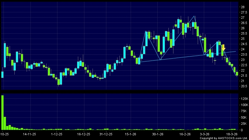頭肩頂是典型的沽出訊號,當股價跌穿支持線(頸線)時,跌勢確認股價將持續下跌,技術走勢偏軟。(港股報價延遲最少十五分鐘。沽空資料截至 2026-03-25 16:25。)