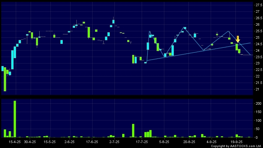 FAST RETAIL-DRS(06288.HK) +0.780 (+3.220%) 呈現頭肩頂向下突破。現價報23.660,無升跌,成交量0.00股,成交額0.00。