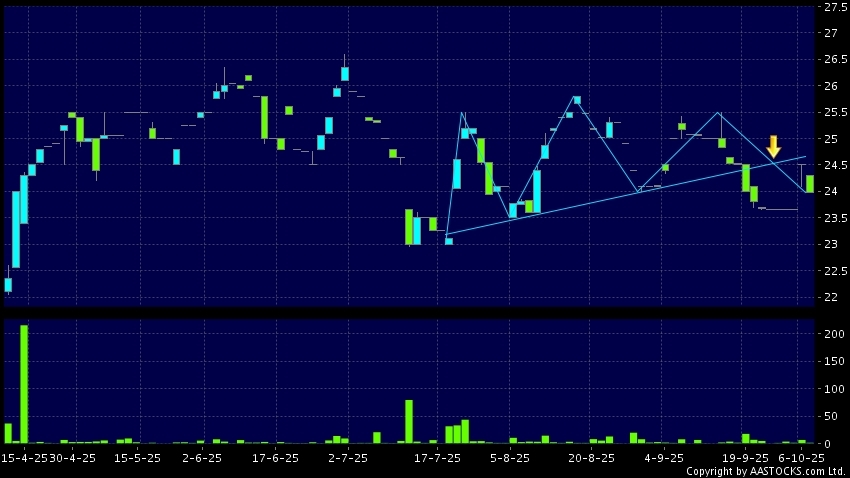 頭肩頂是典型的沽出訊號,當股價跌穿支持線(頸線)時,跌勢確認股價將持續下跌,技術走勢偏軟。(港股報價延遲最少十五分鐘。)