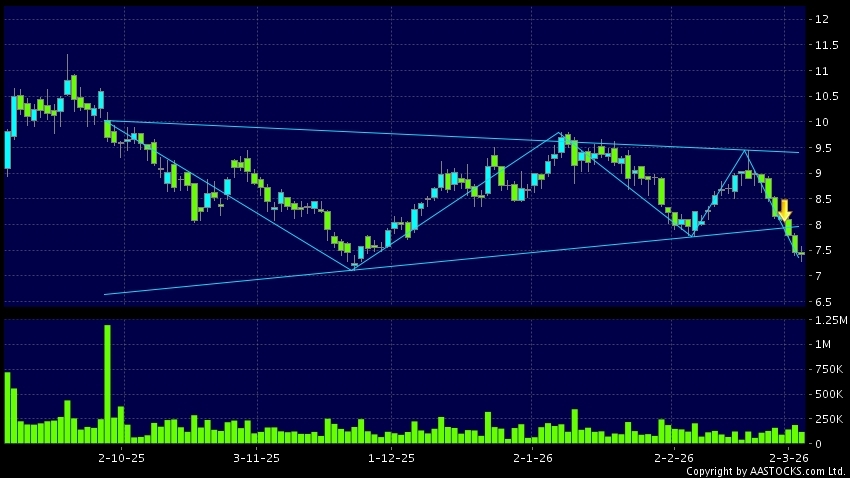 三角形向下突破是指股價的波幅漸漸收窄,在圖表上形成三角形般的狀態。股價在三角形的末端向下突破,下跌趨勢形成,技術走勢偏軟。(港股報價延遲最少十五分鐘。沽空資料截至 2026-03-04 16:25。)