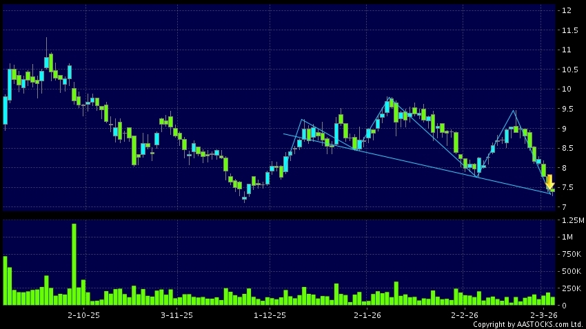 頭肩頂是典型的沽出訊號,當股價跌穿支持線(頸線)時,跌勢確認股價將持續下跌,技術走勢偏軟。(港股報價延遲最少十五分鐘。沽空資料截至 2026-03-04 16:25。)
