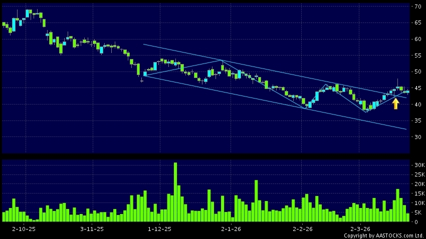 區域突破指股價在過去的一段時間只在一個範圍在內活動,然後股價上升作出突破,升穿區域的頂部,技術走勢向好。(港股報價延遲最少十五分鐘。沽空資料截至 2026-03-20 16:25。)
