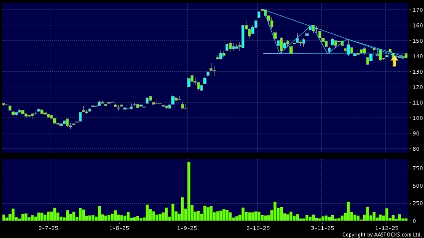 三角形向上突破是指股價的波幅漸漸收窄,在圖表上形成三角形般的狀態。股價在三角形的末端向上突破,形成上升趨勢,技術走勢向好。(港股報價延遲最少十五分鐘。沽空資料截至 2025-12-10 12:25。)