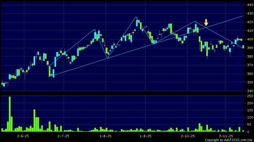 香港交易所-R(80388.HK)  -9.600 (-2.410%)    沽空 $3.25百萬; 比率 48.103%   呈現頭肩頂向下突破。現價報390.000,下跌2.108%,成交量1.00萬股,成交額3.92百萬。